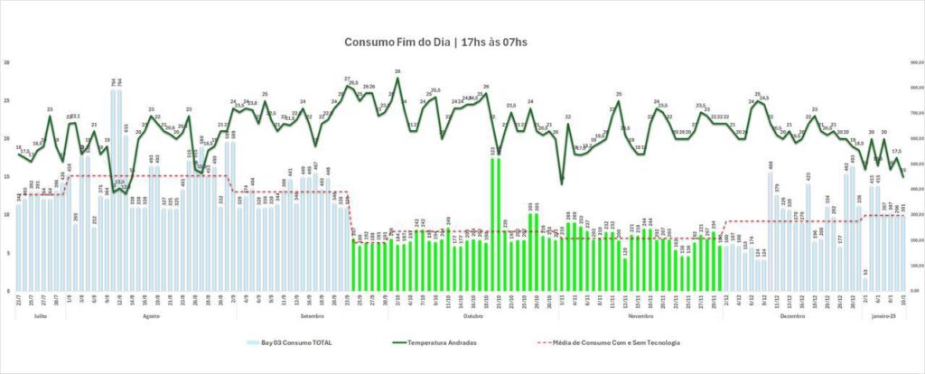Com a implementação da THRUSTER, as barras verdes revelam uma transformação imediata e drástica no padrão de consumo. O consumo não apenas diminuiu, mas também se estabilizou em um patamar significativamente mais baixo e constante.